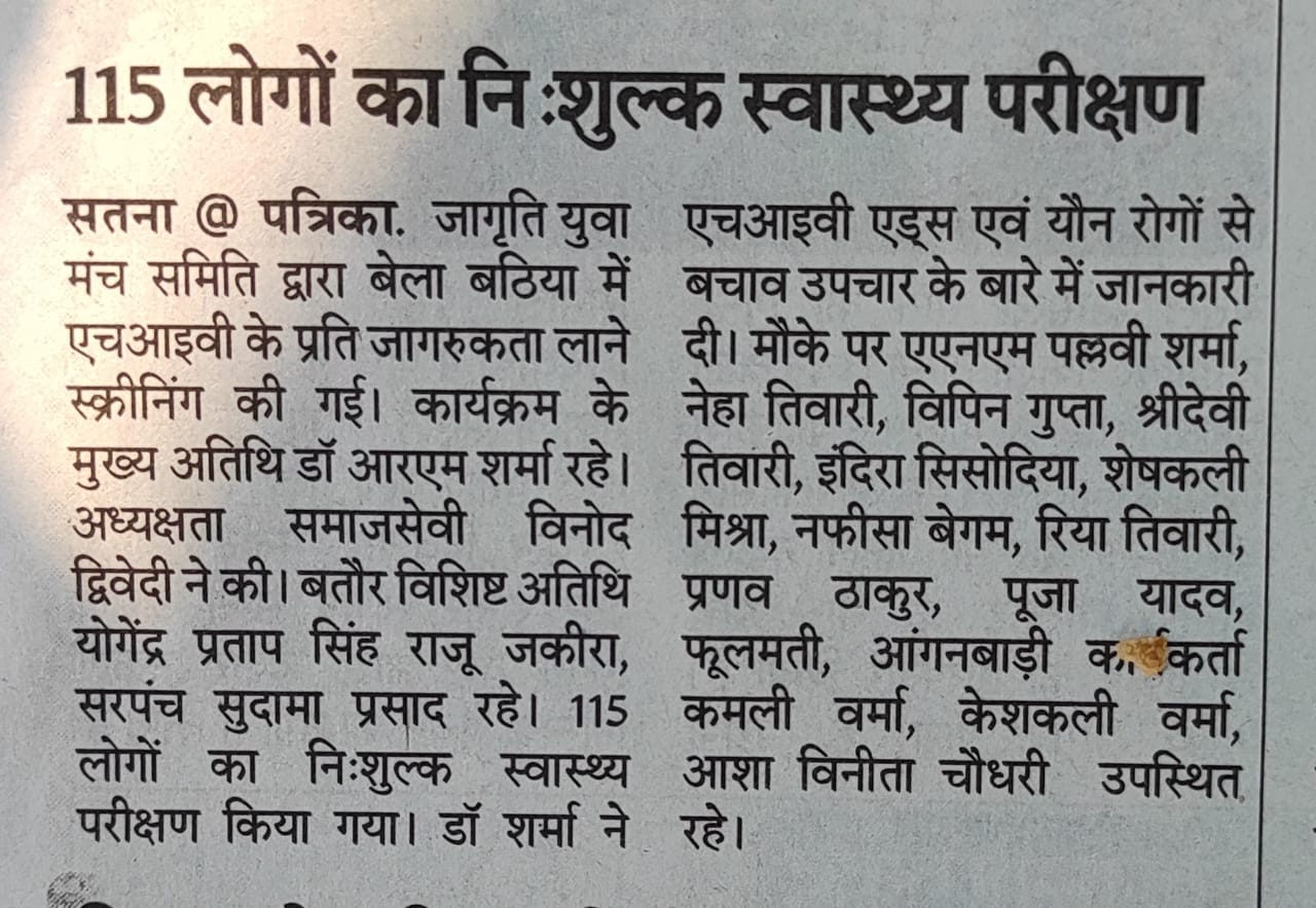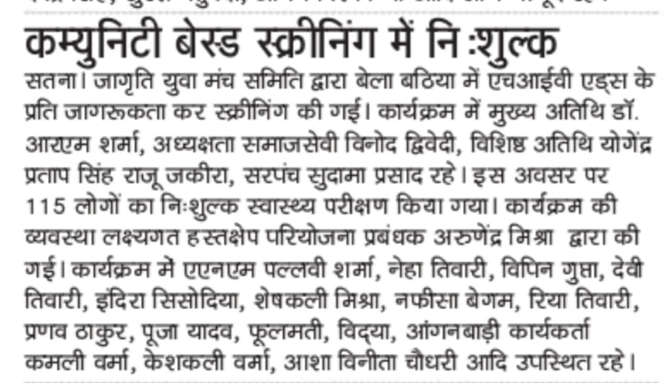 Awareness of HIV AIDS was screened at Bela Bathia by Jagriti Yuva Manch Committee. The chief guest at the program was Dr. RM Sharma, chaired by philanthropist Vinod Dwivedi, special guest Yogendra Pratap Singh Raju Zakira, Sarpanch Sudama Prasad. 115 people were tested free of cost. The program was arranged by the team of Targeted Intervention Project Manager Arunendra Mishra. Vinod Dwivedi gave information about Pradhan Mantri Man Dhan Yojana while explaining the schemes for unorganized and bidi workers. Yogendra Pratap Singh Raju Zakira inspired people to take advantage of the project. Dr. RM Sharma gave information about HIV-AIDS and prevention treatment against sexual diseases. In the program, ANM Pallavi Sharma, Neha Tiwari, Vipin Gupta, Shri Devi Tiwari, Indira Sisodia, Sheshkali Mishra, Nafisa Begum, Riya Tiwari, Pranav Thakur, Pooja Yadav, Phoolmati, Vidya, Anganwadi workers Kamli Verma, Keshakali Verma, Asha Vinita Chaudhary etc. were present.