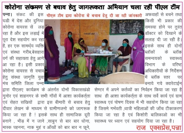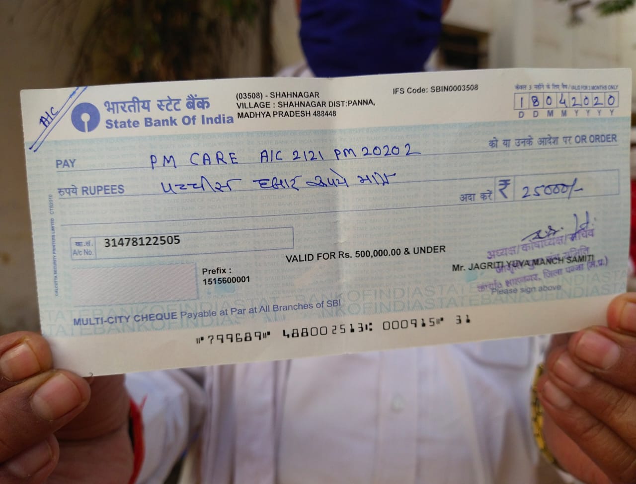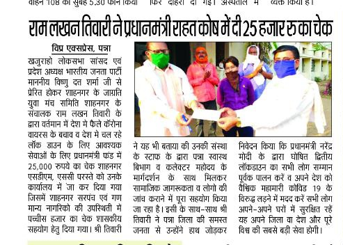 Voluntary organizations are raising their hands in the war against Corona in Panna. Today, a check of Rs 25 thousand was given in PM Care Fund by Ram Lakhan Tiwari, Director of Jagriti Yuva Manch Samiti Shahnagar. He handed over this check to Shahnagar SDM Mr. S.C. Paraste at his office and handed over the entire distance. Significantly, the Government of India is working on a war footing to deal with the global pandemic Covid-19. Currently, this amount has been given in the Prime Minister's Fund by the social service organization Jagriti Yuva Manch Committee for the necessary services on the prevention of Carona virus and the second lock down in the country. He has done this work inspired by the works of regional MP and state BJP President Mr. Vishnudutt Sharma. Shri Tiwari ji also informed that with the guidance of Panna Health Department and Collector, guidance of staff of his organization, full cooperation is being done in social awareness and checking of people.