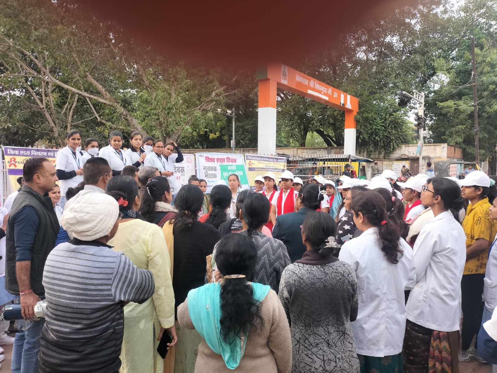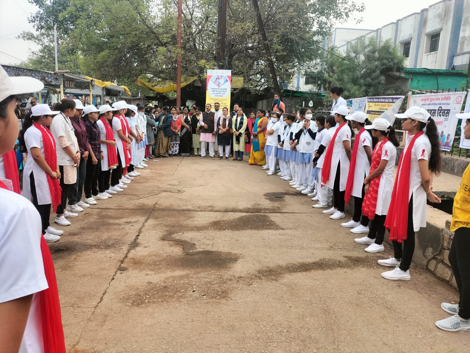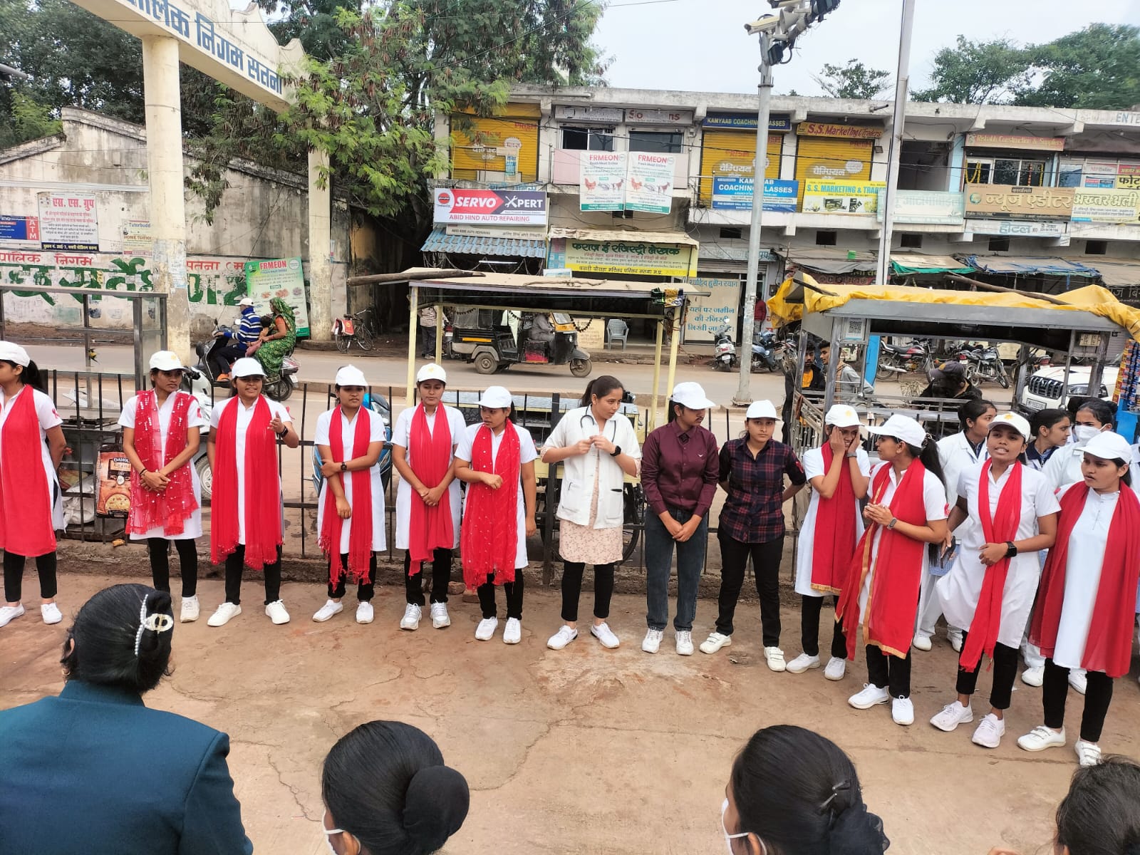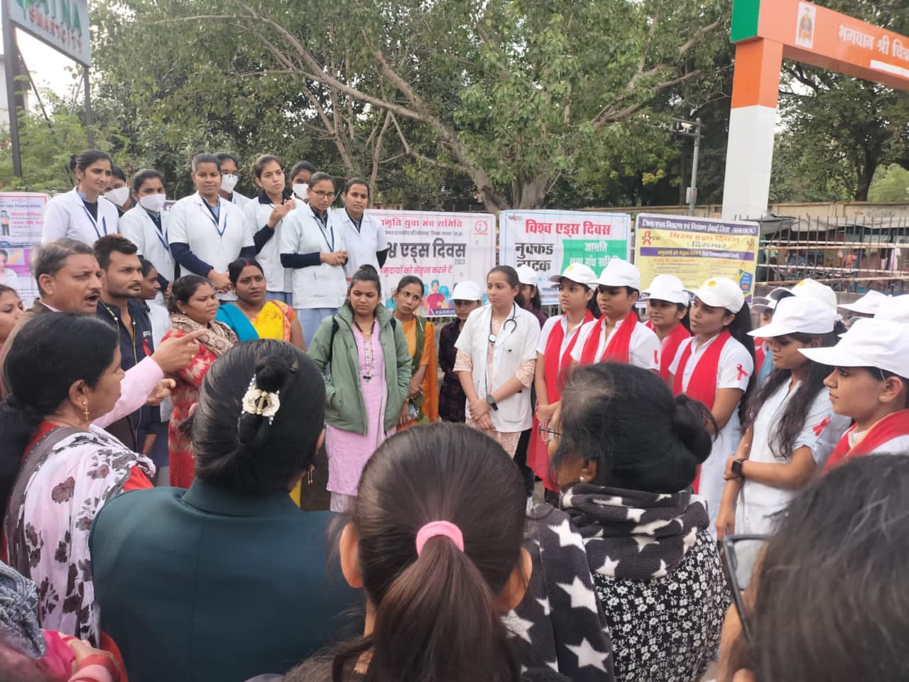 High risk group community and members of Jagriti Yuva Manch Committee Red ribbon and street drama organized in Dhawari intersection Principal of Government Narsingh College, Mrs. Uma Verma was present in today's program. In today's programme, information about HIV/AIDS, sexually transmitted diseases, TB and 1097 toll free number was given. In this street play awareness campaign, students of Government Narsingh College and community members demonstrated through posters and informative pamphlets. Today, awareness about HIV AIDS was created through audio and mid media activity at Dhwari Square. Community members and staff participated in HIV AIDS awareness campaign by putting red ribbon on passengers, auto, bus, rickshaw, car driver and pedestrians at Dhwari intersection. In today's program, high risk community participated enthusiastically and made this program successful. In today's program, ICTC consultant Neeraj Tiwari, DSRC consultant Aparna Tripathi and PM Jyoti Pandey, Pier, high risk community and staff from the Targeted Intervention Project were present.