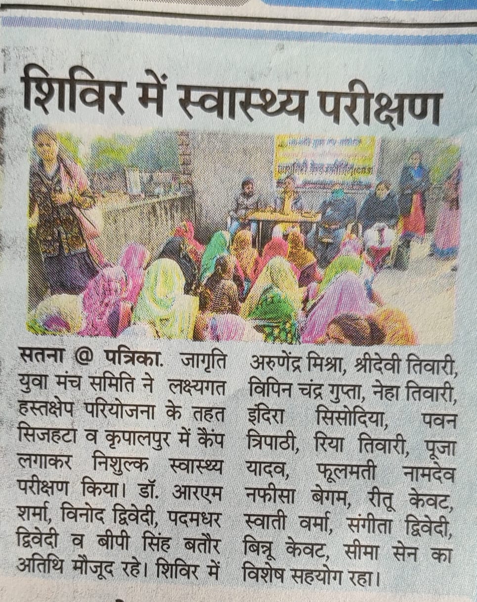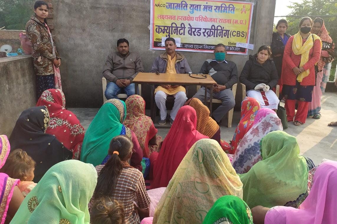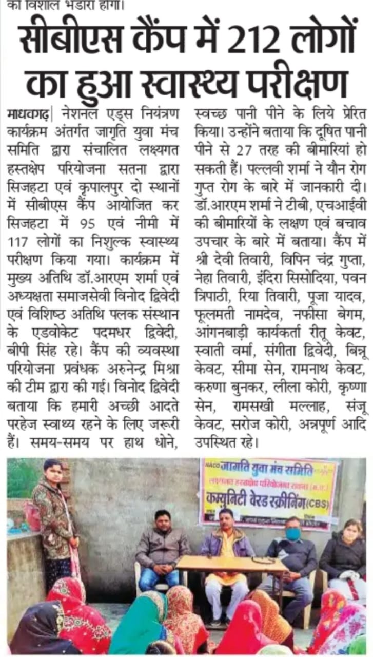Satna 1 January 2021. Under the National AIDS Control Program, a targeted intervention project conducted by Jagriti Yuva Manch Committee Satna conducted a CBS camp in two places at Sijhata and Kripalpur and conducted free health tests of 117 people in Sijhata at 95 and Neemati. The chief guest at the program was Dr. RM Sharma and chaired by philanthropist Vinod Dwivedi and distinguished guest Palakadhan Advocate Padamadhar Dwivedi, BP Singh. The camp was arranged by the team of project proponent Arunendra Mishra. Vinod Dwivedi told that our good habits are necessary for avoiding health. Inspired to wash hands and drink clean water from time to time. He said that drinking contaminated water can cause 27 types of diseases. N. M. Pallavi Sharma gave information about sexually transmitted disease. Dr. RM Sharma spoke about the symptoms and preventive treatment of diseases of TB, HIV. Camps include Shri Devi Tiwari, Vipin Chandra Gupta, Neha Tiwari, Indira Sisodia, Pawan Tripathi, Riya Tiwari, Pooja Yadav, Phoolmati Namdev, Nafisa Begum, Anganwadi worker Ritu Kewat, Swati Verma, Sangeeta Dwivedi, Binnu Kewat, Seema Sen, Ramnath Kewat , Karuna Weavers, Leela Kori, Krishna Sen, Ramsakhi Mallah, Sanju Kewat, Saroj Kori, Annapurna etc. were present.